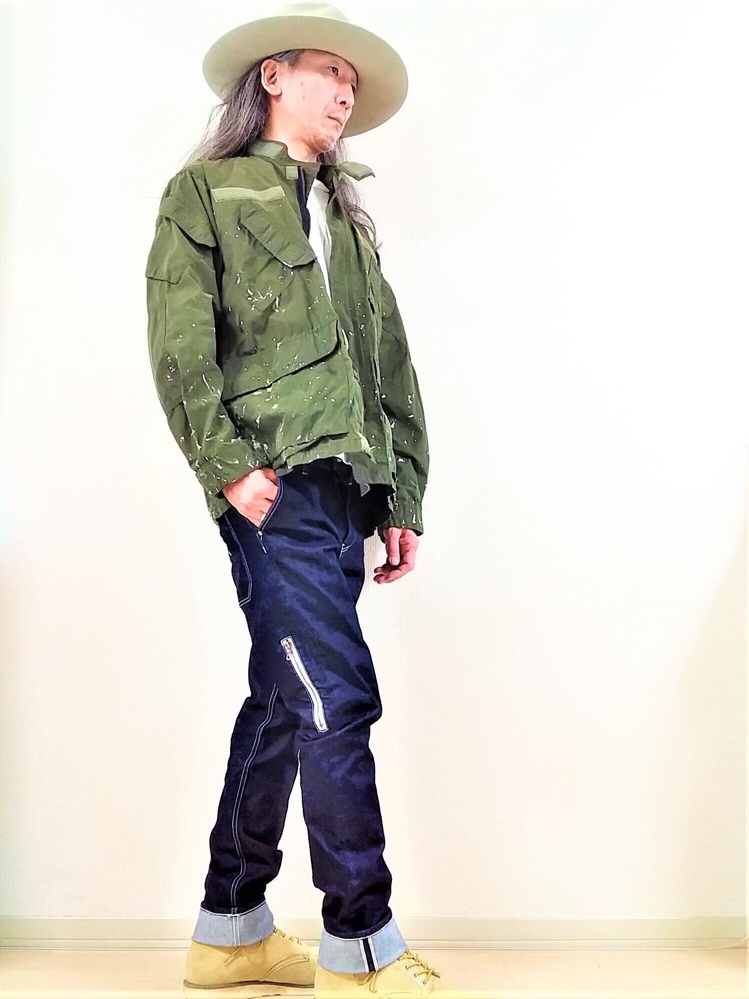 〇スリムタイプのブーツカットデザインです。 〇フロントポケットはスラッシュタイプになっています。70年代のラングラーのフロントポケットが少しスラッシュに近い形状になっていて、非常に使いやすかったのでモチーフに取り入れました。 〇右腿裏にファスナーポケットを付けています。変形の5Pパンツになります。 〇右後ろのポケットには、斜めにデザインしたマチを付け、容量を増やしています。